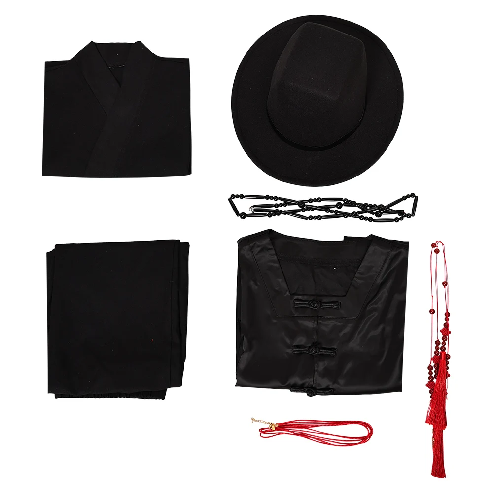 Saja Jinu Cosplay Costume – Kpop Devil Hunter Cosplay – Men’s Black Outfit with Headgear, Hat and Red Belt Set – Cartoon Style Halloween Costume – NVT61