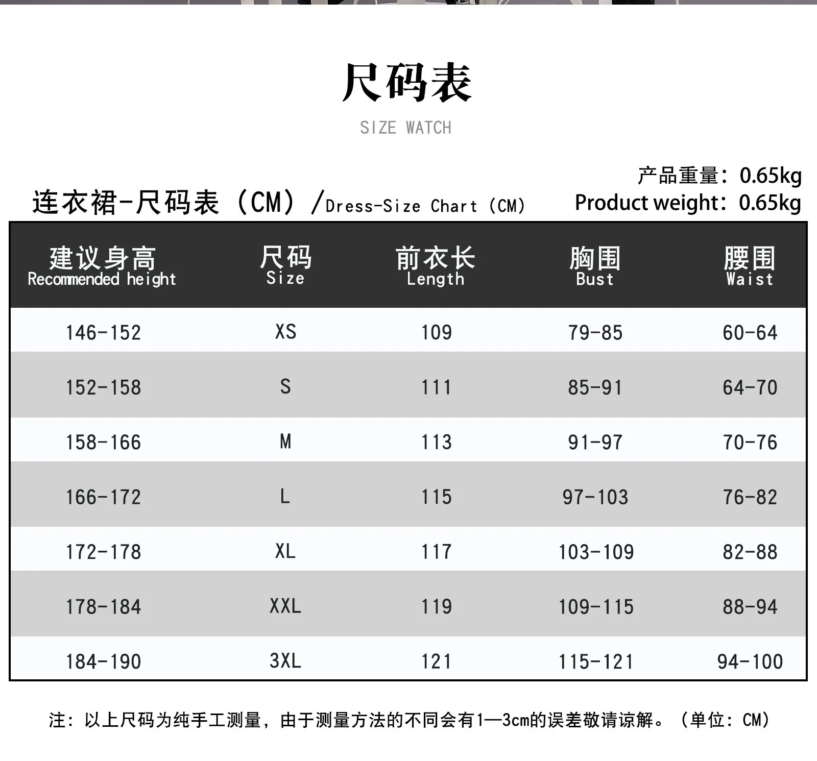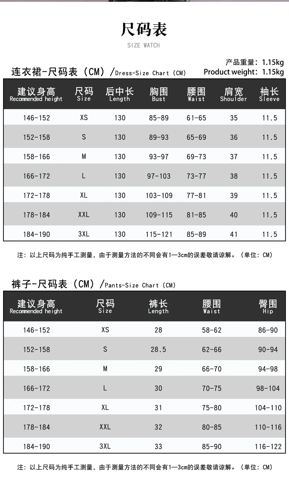 The size chart is measured manually so there may be an error of 1-3cm, which is not a reason for return or exchange